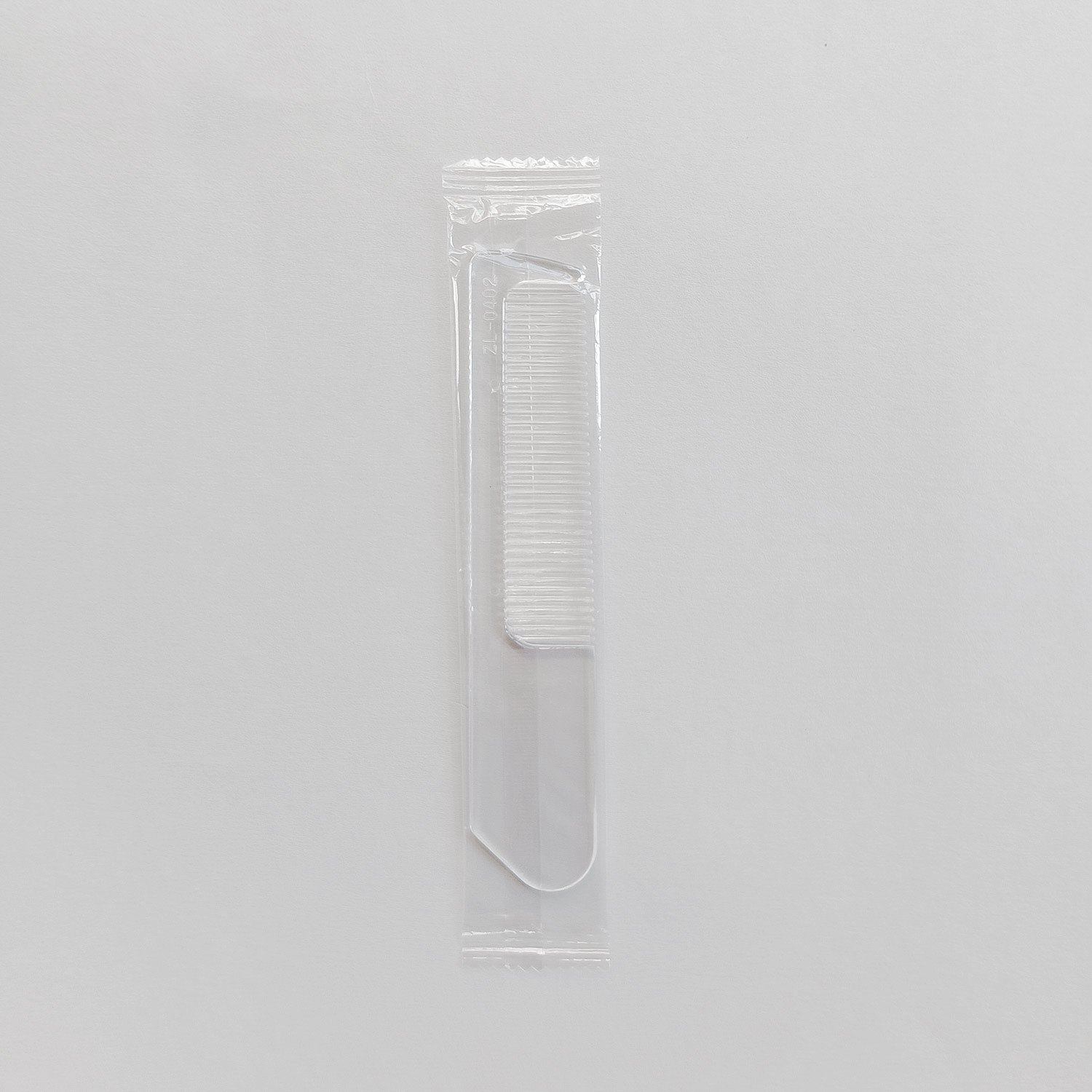 Универсальная пластиковая расческа небольшого размера в индивидуальной упаковке, для гостиничных номеров.