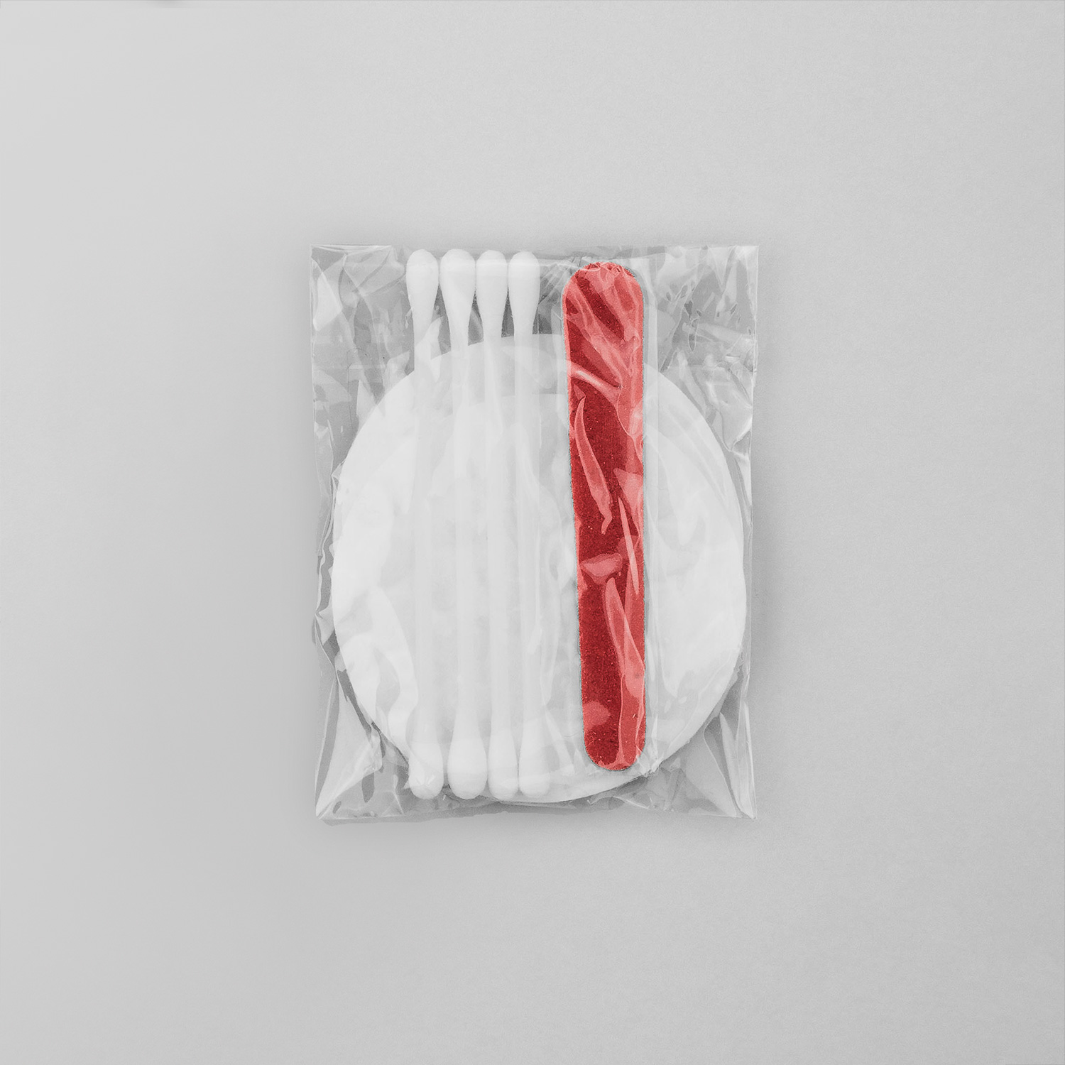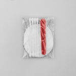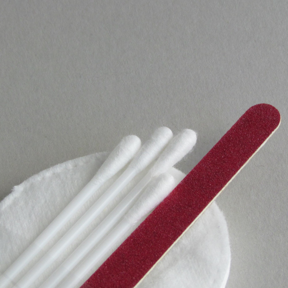 В комплекте: 4 ватные палочки, 3 ватных диска (100% хлопок), пилочка для ногтей.