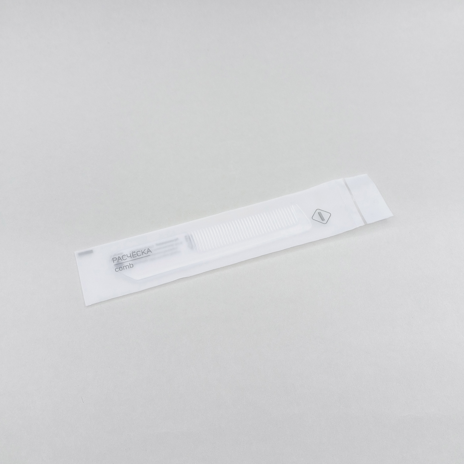 Универсальная пластиковая расческа небольшого размера в индивидуальной упаковке, для гостиничных номеров. Простая и лаконичная нейтральная упаковка в минималистичном дизайне.