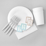Комплектность: тарелки, стаканы, вилки, соль, перец, салфетки бумажные