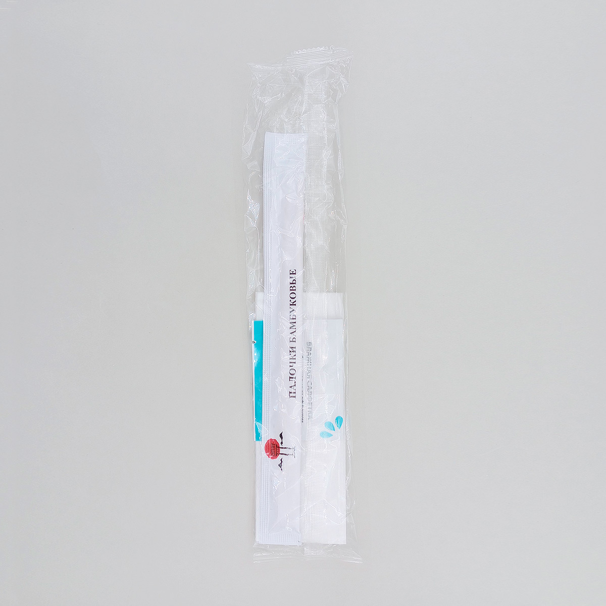 В набор входят: палочки для еды, сухая салфетка, влажная салфетка