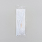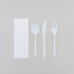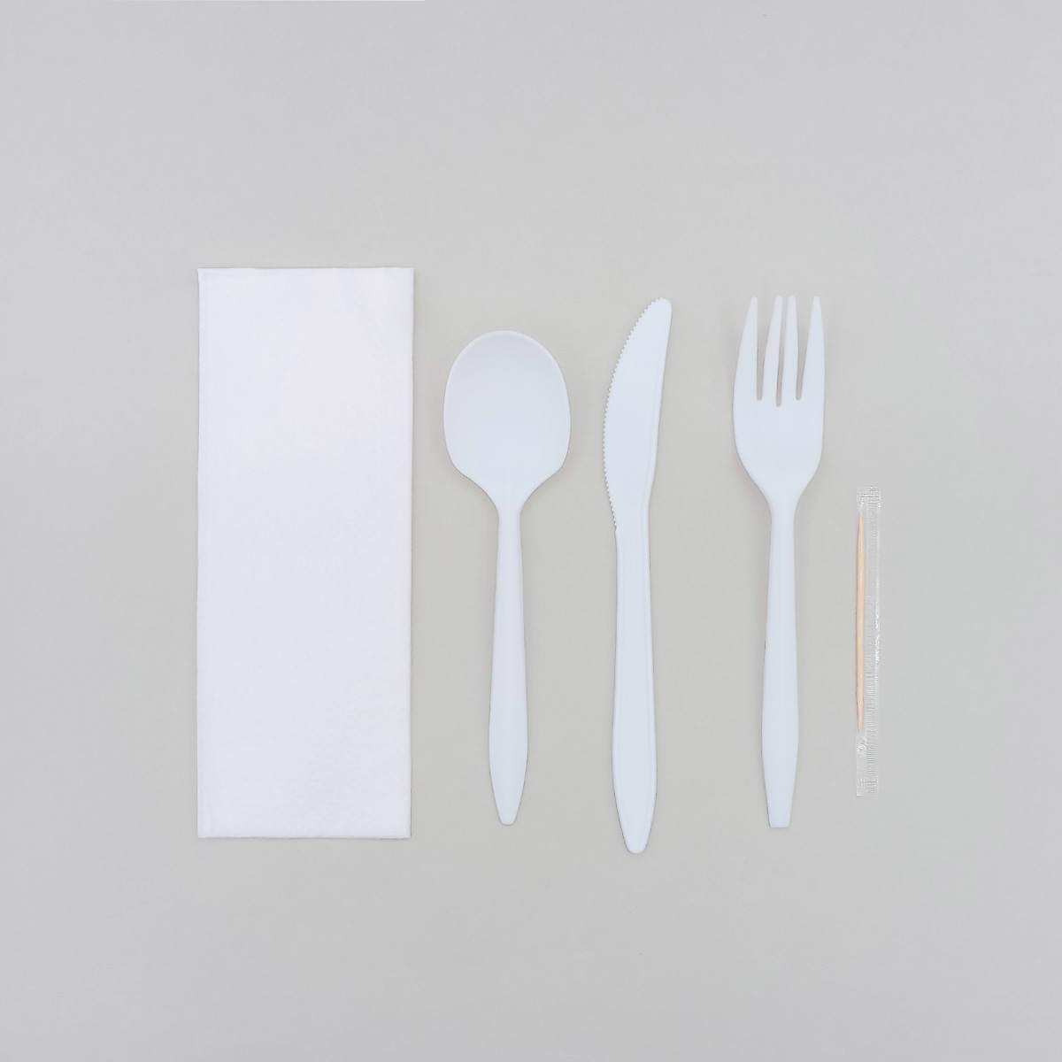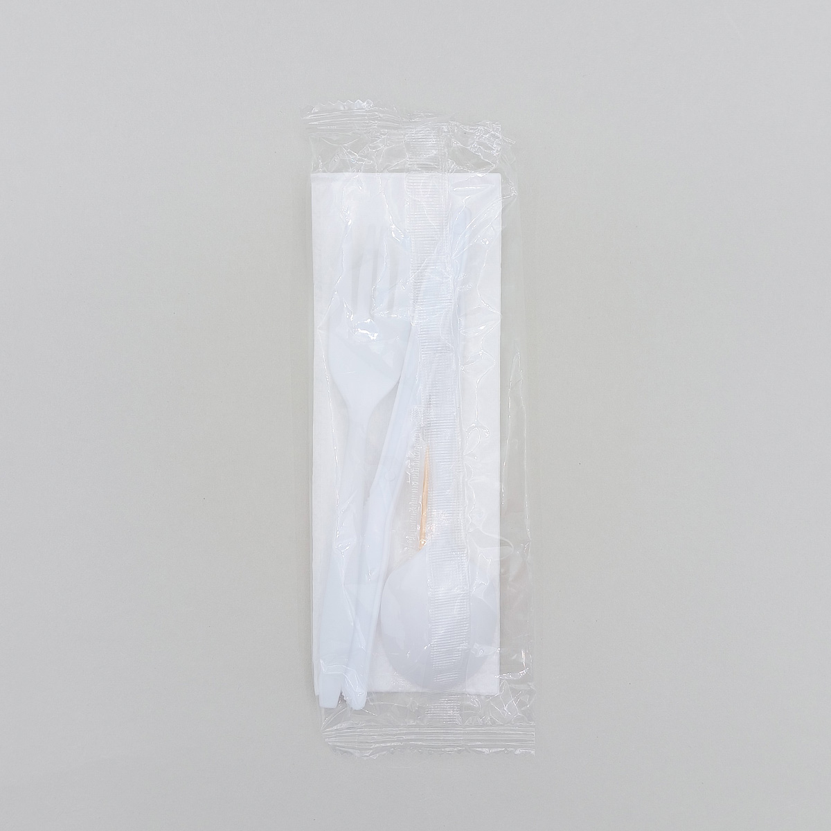 Индивидуальный набор одноразовых столовых приборов с сухой бумажной салфеткой и зубочисткой.